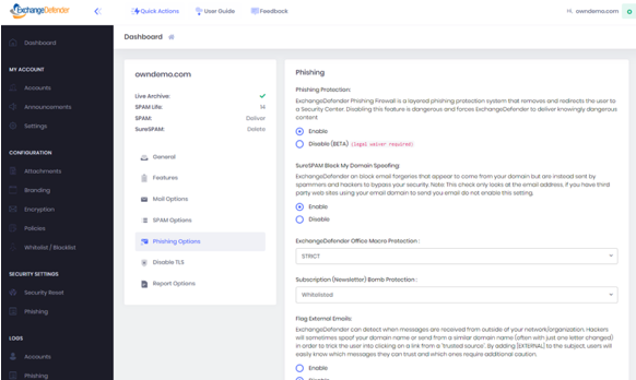 After this setting is applied, all messages from your domain that were sent from outside of the ExchangeDefender network will go into the SureSPAM quarantine. Just tell users not to trust, whitelist, or release messages that are coming from your own domain because they are certainly not legitimate.