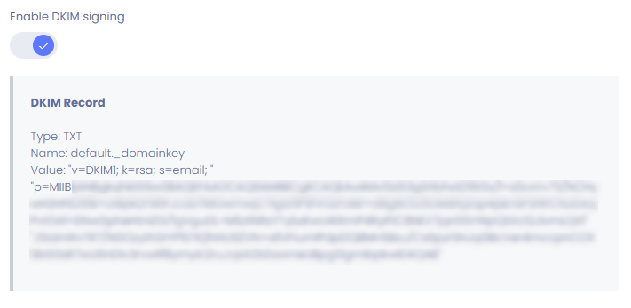 After enabling DKIM signing, your public DKIM key will be provided immediately and ExchangeDefender will begin signing outbound messages within one hour.