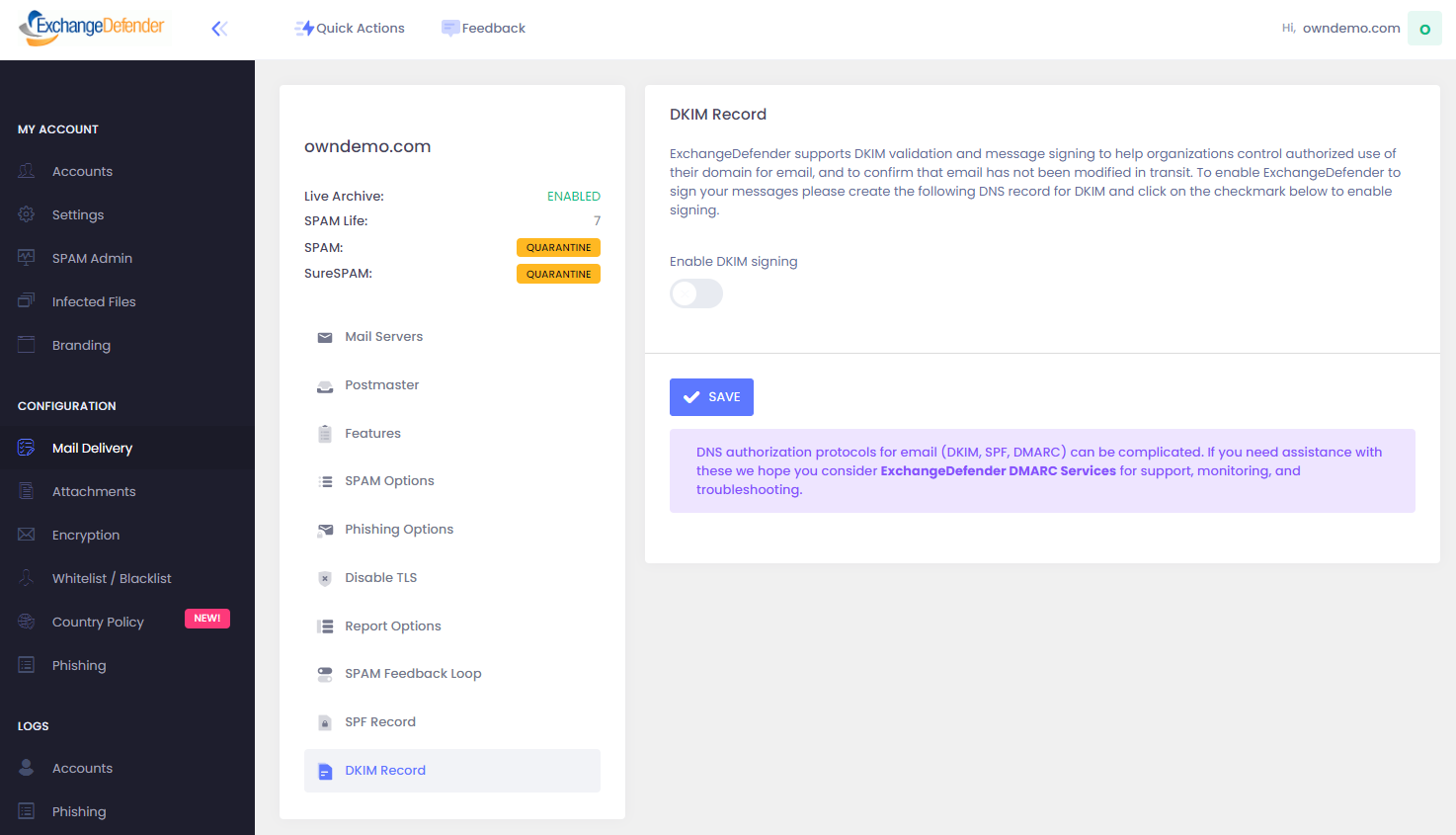 Outbound DKIM implementation is optional and can be enabled or disabled by Domain Administrators on demand at https://admin.exchangedefender.com. Click on Mail Delivery, DKIM Record, and Enable DKIM Signing.