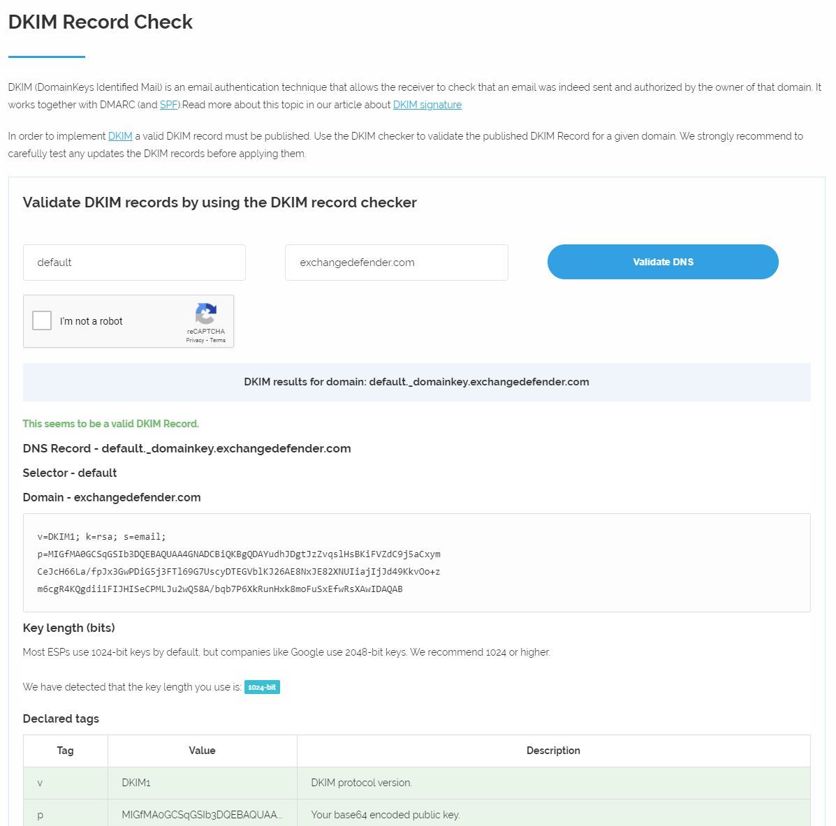 ExchangeDefender fully supports DKIM for both incoming and outgoing mail. On the incoming side, we verify DKIM signatures. On the outgoing side, all your sent mail going through ExchangeDefender will be signed with a 2048-bit key allowing others to confirm no one has forged mail from your domain or tampered with messages while en route.