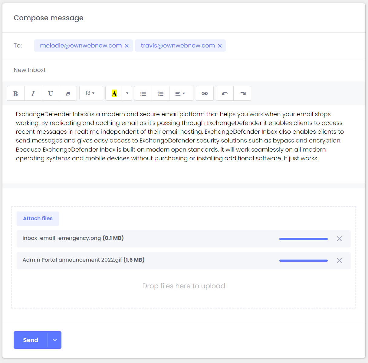 ExchangeDefender Inbox features a modern and responsive user interface that will be familiar to users of popular email solutions such as Gmail and Outlook Web App. Just click on New Message or Reply / Forward and you will be presented with the message editor.