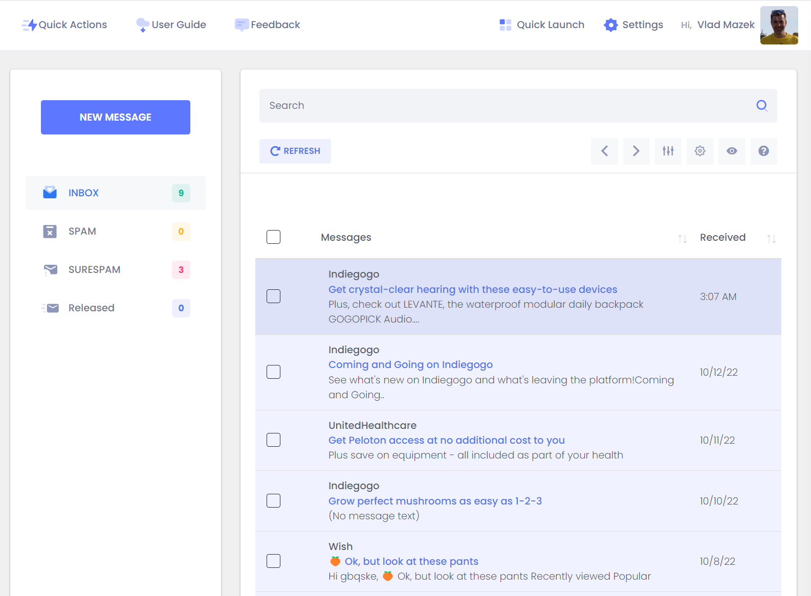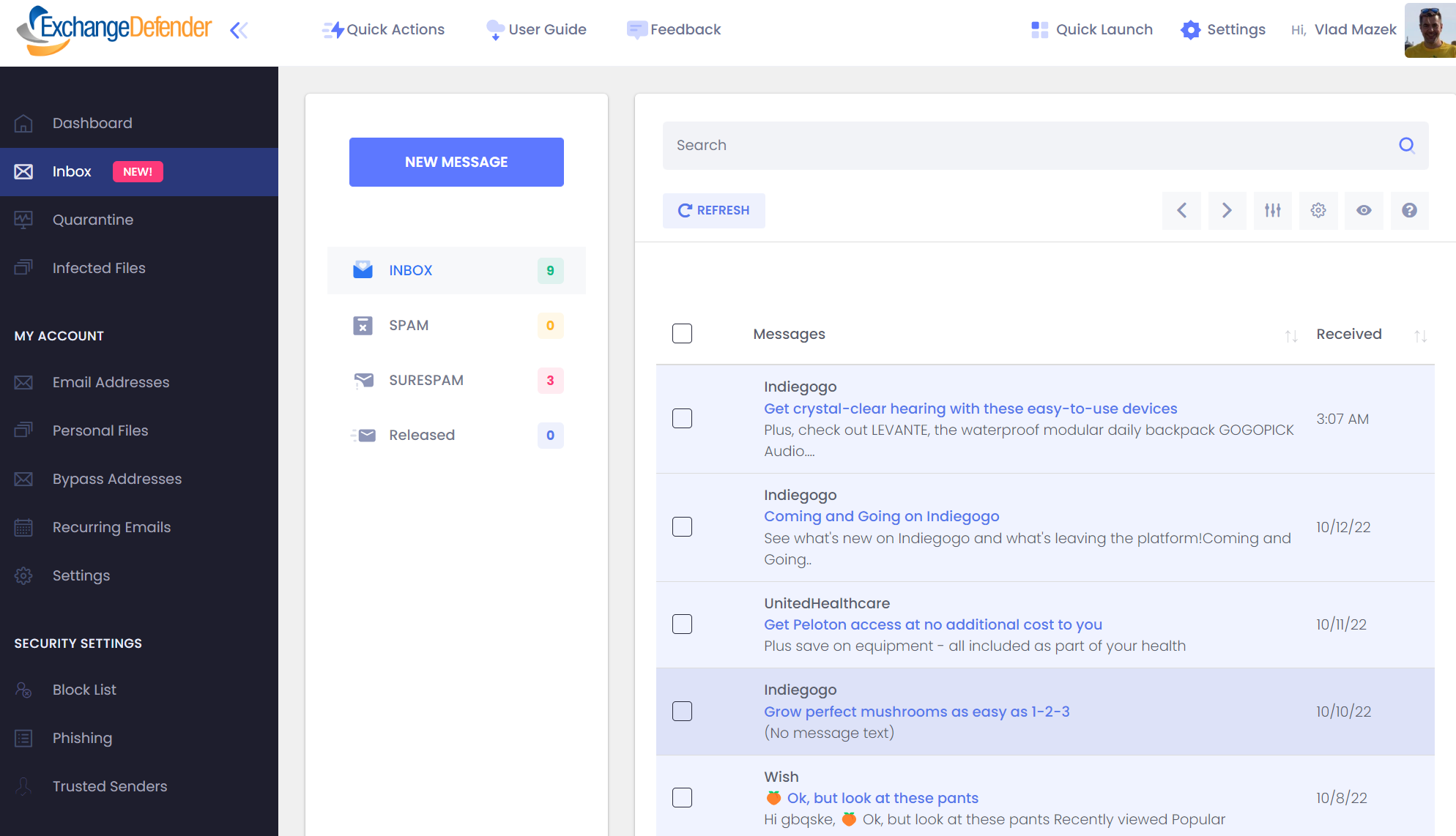 ExchangeDefender Inbox minimalist layout makes it easy to use and works similarly to Outlook and Gmail.